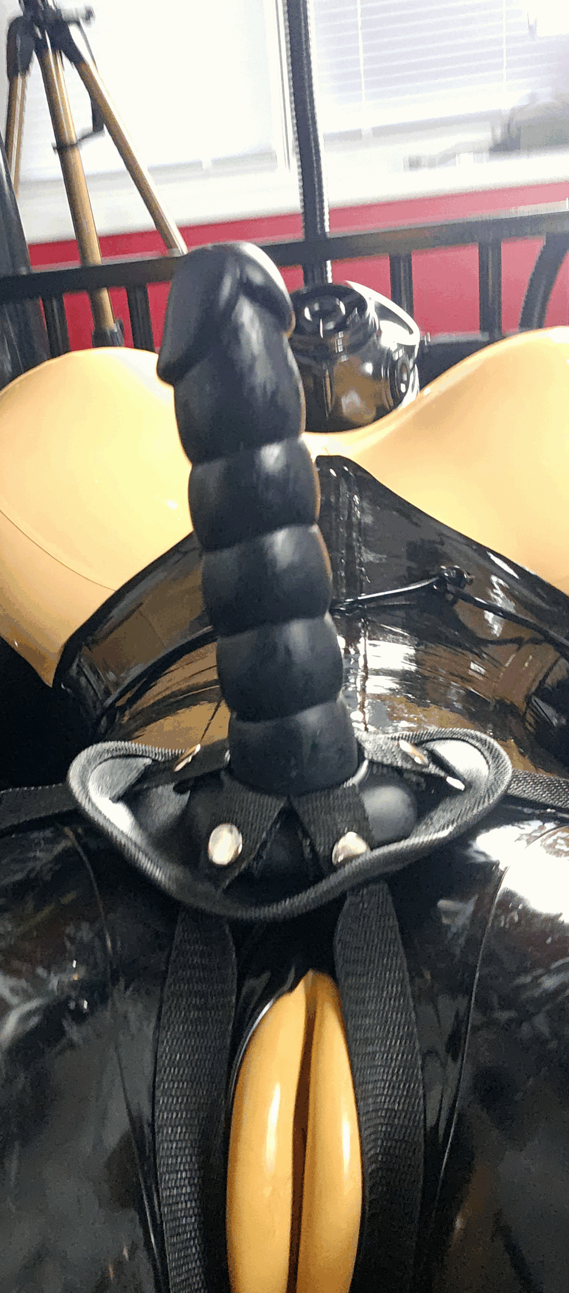 Today I’m wearing one of my favorite rubber suits — sleek, black, and impossibly tight, clinging to every curve of my body like a second skin. My huge flesh-toned breasts press against the latex, full and heavy, and between my thighs my shiny rubber pussy glistens through, a wicked invitation wrapped in glossy perfection.
